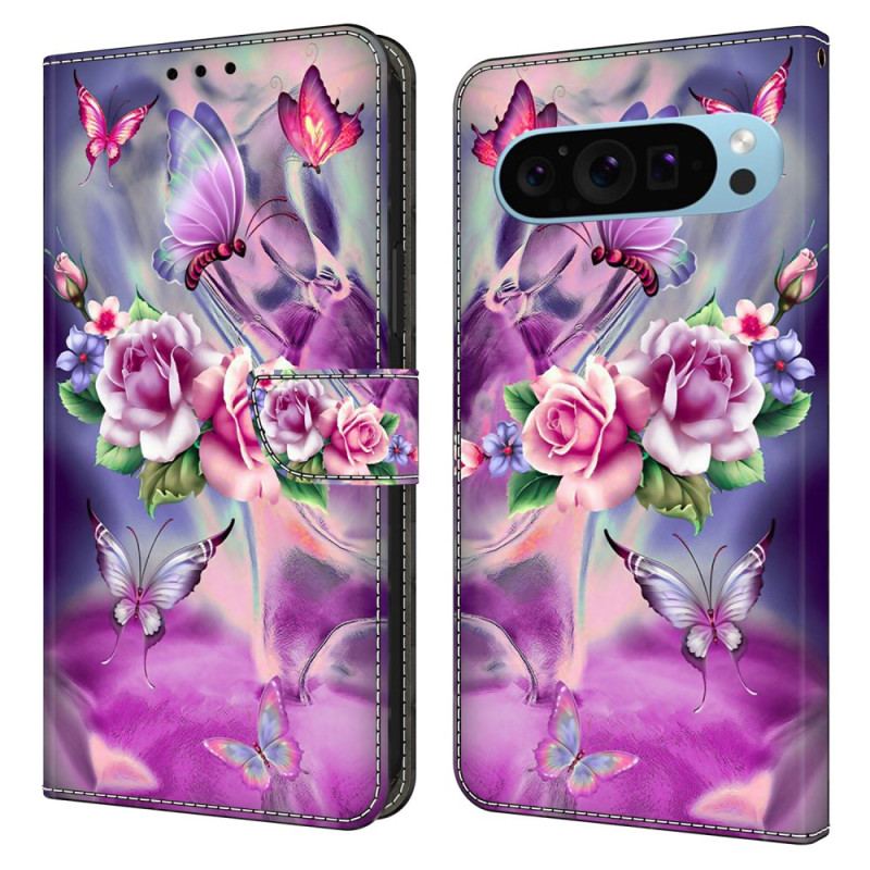 Fodral För Google Pixel 9 Pro Fjärilar Och Blommor Lila