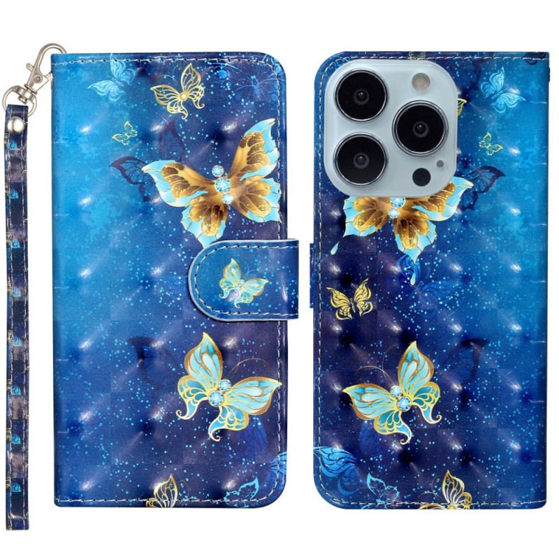 Fodral För iPhone 16 Pro Blå Och Guld Fjärilar Med Rem