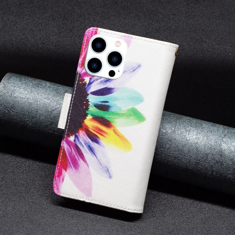 Detta Unika Telefonfodral För Iphone 16 Pro Max Har Distinkt Mönstertryck Och Solrosdesign. Den Är Designad Med Kortplatser Och Ett Kassafack, Samt En Ficka Med Dragkedja För Extra Förvaring.