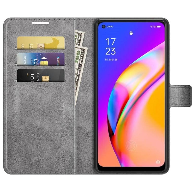 Höljet i läderstil skyddar hela Oppo A94 5G samtidigt som det bär din kort och sedlar tack vare dess plånboksfunktion.