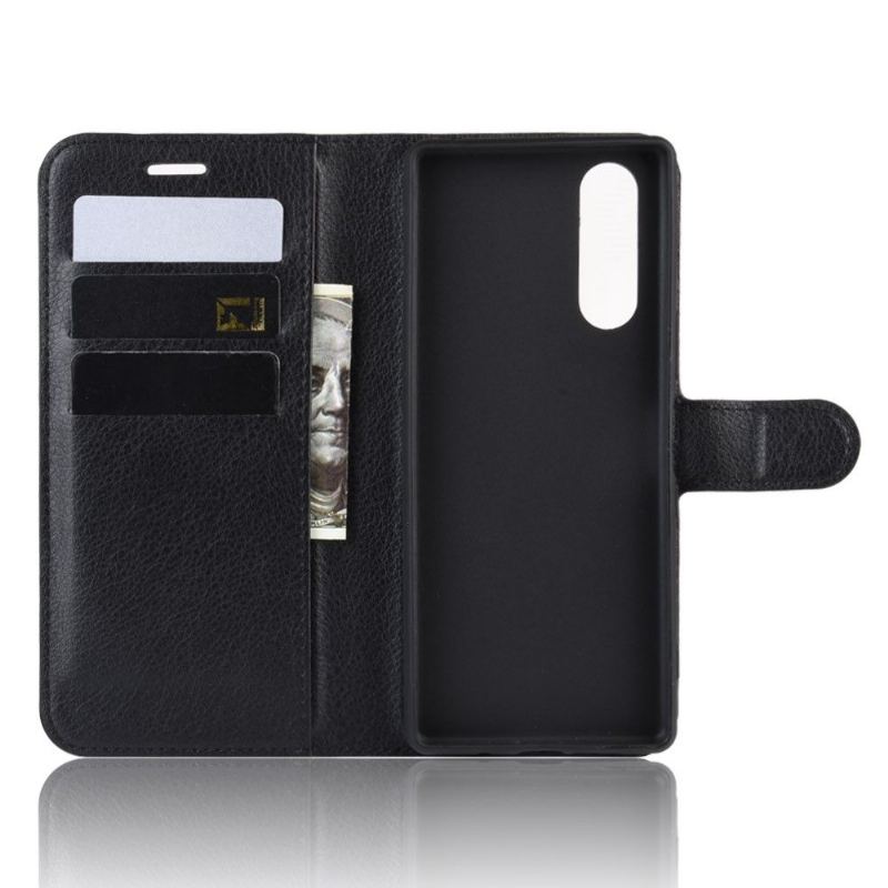Höljet i läderstil skyddar hela Sony Xperia 5 samtidigt som det fungerar som en plånbok och stativ för handsfree-användning av telefonen.