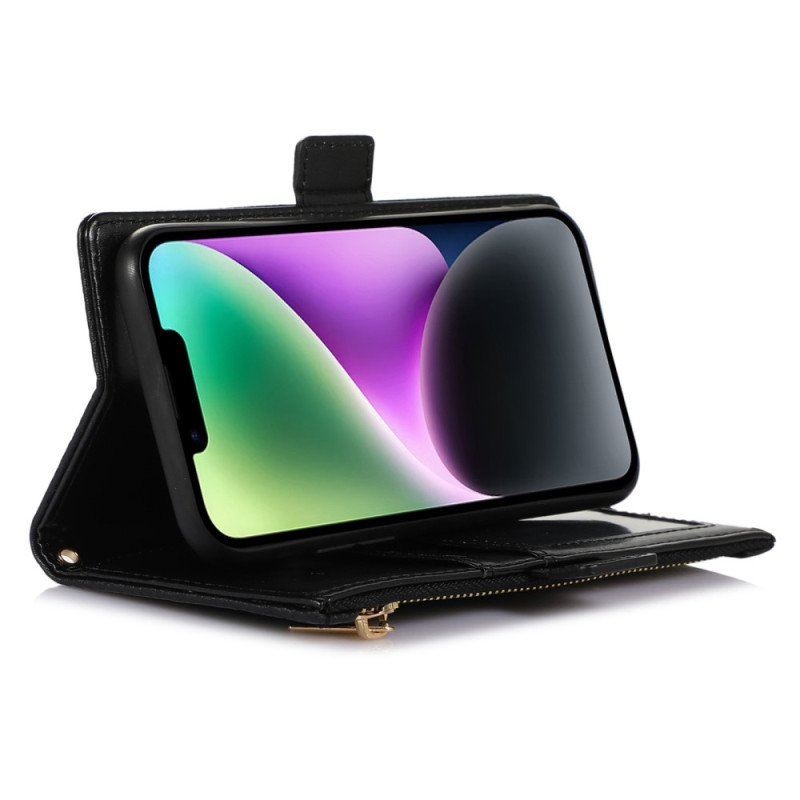 Höljet I Lädereffekt Litchi Med Dragkedja Fäster Perfekt Iphone 14 Plus Samtidigt Som Den Fungerar Som En Plånbok (Med En Fäst Rem).