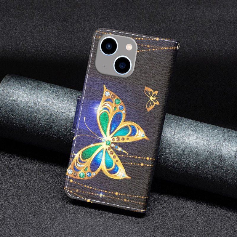 Det Här Skalet Dekorerat Med En Guldfjäril Är Idealiskt För Din Iphone 15 Plus Och Fungerar Som En Plånbok.