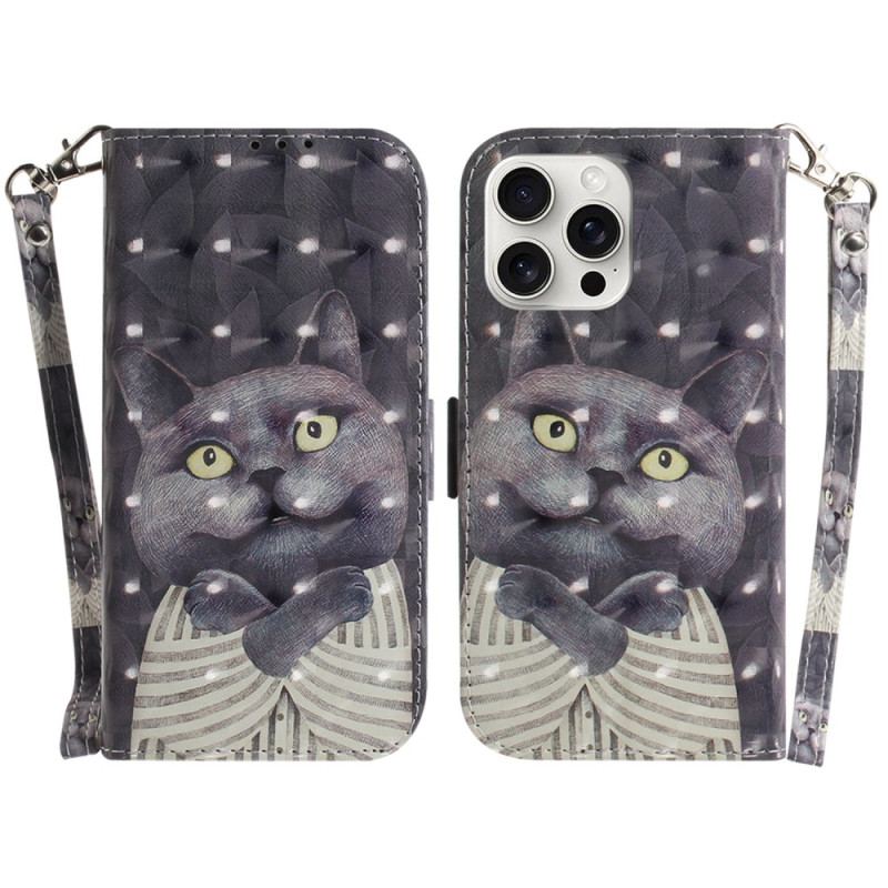 Kolla In Vårt Plånboksfodral För Iphone 16 Pro Med Ett 3D-Mönster Av En Grå Katt.