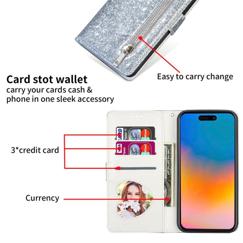 - Kvaliteten På Pu-Läder I Kombination Med Ett Tpu-Skal Ger Bra Fallmotstånd Och Stötdämpning. Tillsatt Glitterpulver Gör Fodralet Bländande I Solen Eller Under Ljus