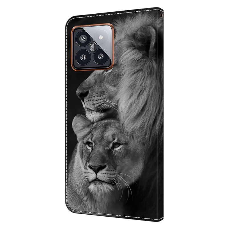 Upptäck Vårt Eleganta Plånboksfodral För Xiaomi 14 Pro, Dekorerat Med Ett Distinkt Mönster Av Lejon I Par.