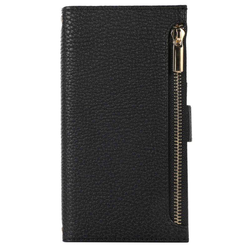 Skydda Din Iphone 14 Pro Med Detta Flip-Fodral I Litchi-Konfektläder Utrustad Med En Frontficka Och En Rem.