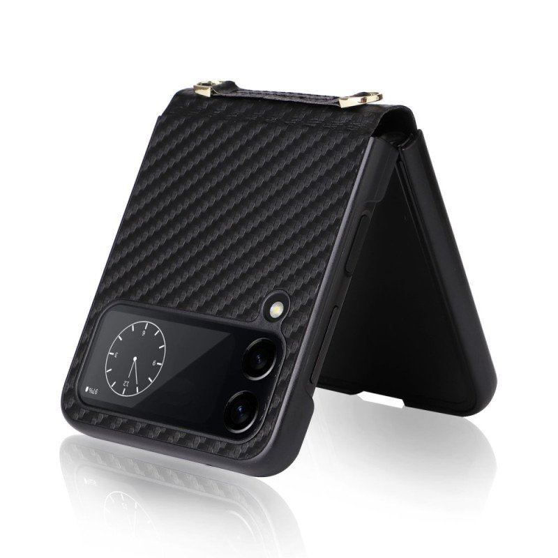 Din Samsung Galaxy Z Flip 4 5G Är Perfekt Säker Med Detta Plastfodral Med Kolfiberstruktur Med Axelrem.