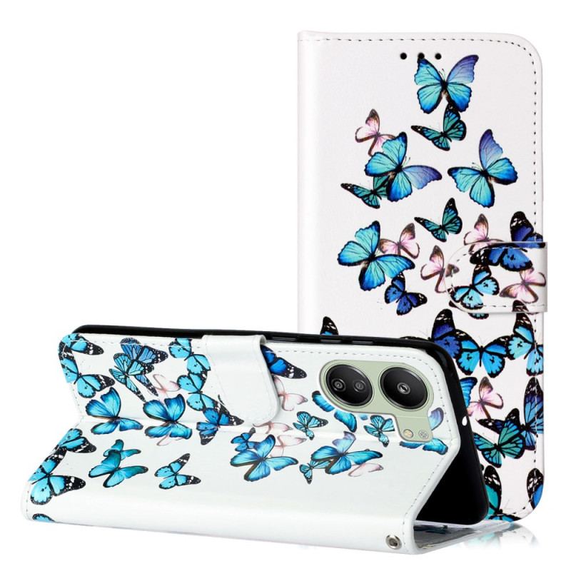 Upptäck Vårt Fodral För Xiaomi Redmi 13C 4G/5G/Poco C65. Med En Magnetisk Stängning Och Blå Fjärilar.