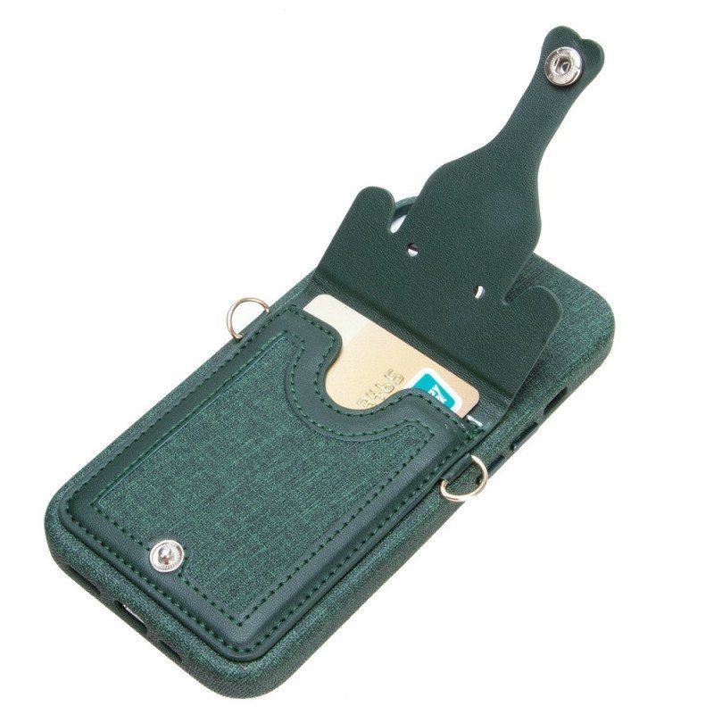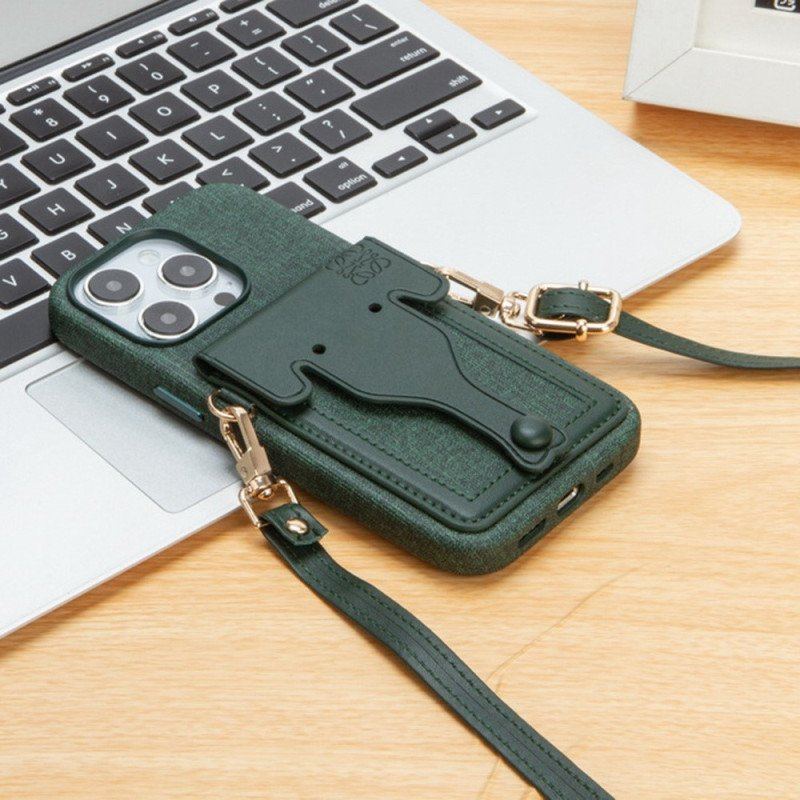 Din Iphone 14 Är Perfekt Skyddad Med Detta Fodral Med En Hållare För Elefantkort Och En Rem.