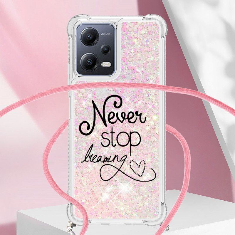 Din Xiaomi Redmi Note 12 5G/Poco X5 5G Är Mycket Väl Skyddad Med Detta Fodral Med Dragsko Dekorerat Med Never Stop Dreaming-Paljetter.